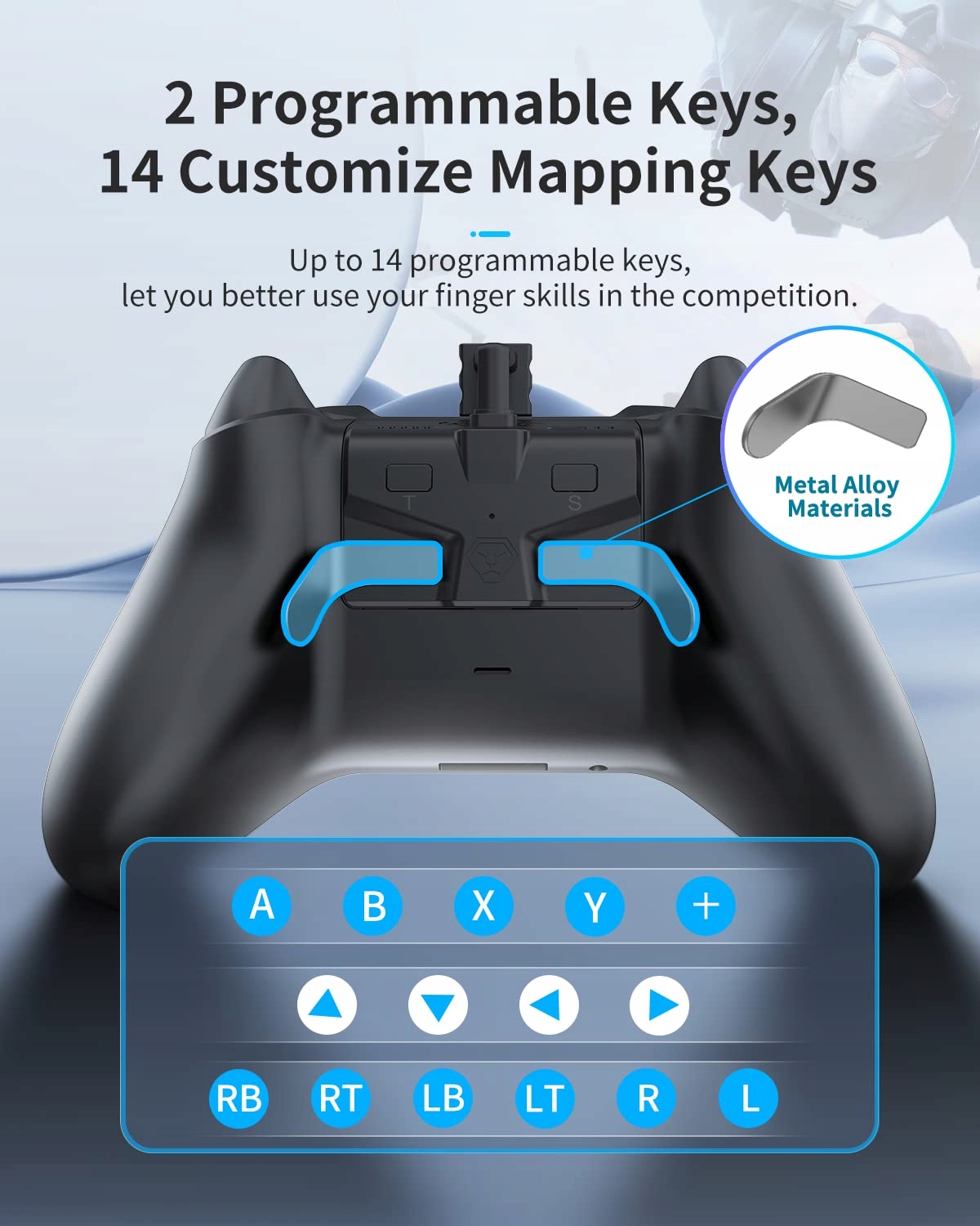 🎮 【Функція програмування】 Ці планшети Xbox оснащені 2 програмованими та швидко реагуючими металевими кнопками на задній панелі, які можуть відображати до 14 ключових функцій і забезпечують неймовірний зворотний зв’язок, дозволяючи краще використовувати ваші навички пальців у змагальних іграх скорочують час реакції та забезпечують більшу гнучкість. Тож ви можете без будь-яких шансів виконувати ігри, стрибаючи та ковзаючи.