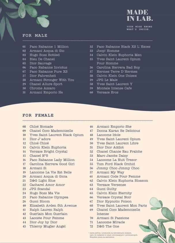 Made in Lab пахнуть так само, як ваші улюблені брендові парфуми, і коштують лише частку від ціни. Ми зосереджуємося на тому, що знаходиться у флаконі, тому що коли ви надягаєте парфум, ніхто не знає, яка була його ціна чи як виглядала упаковка.