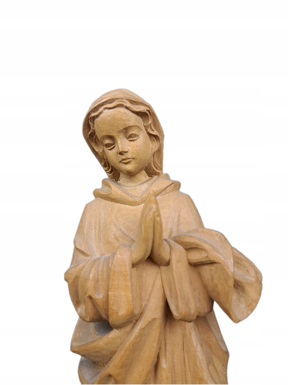 Її ніжне обличчя випромінює мир і любов. Руки, складені в молитві, і плащ, що плавно спадає на фігуру, додають повітря скульптурі