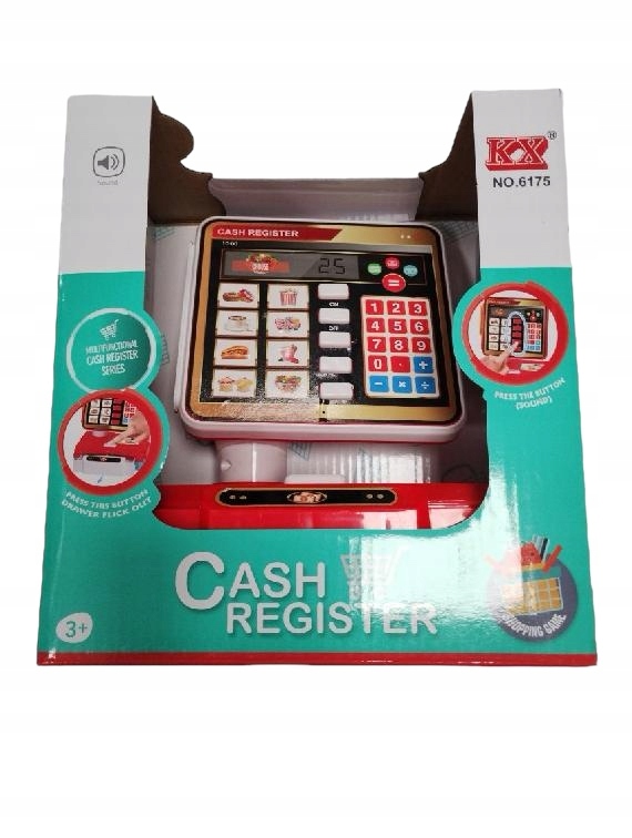 Каса має панель з калькулятором і продуктами, електронний сканер штрих-коду, висувний ящик для грошей (після натискання кнопки), ящик відкривається,