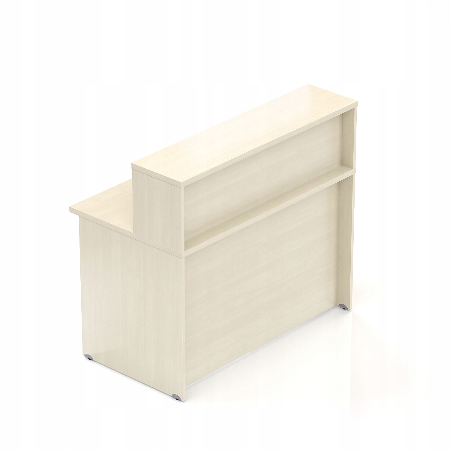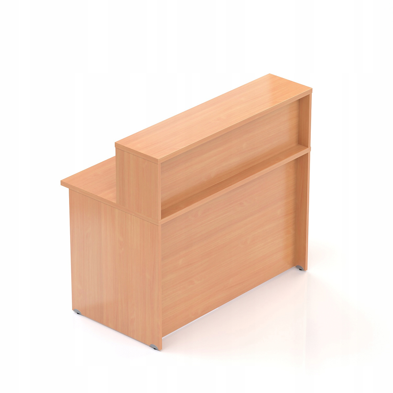Висока офісна стійка з плитними ніжками. Стільниця і верх надставки виготовлені з товстої дошки товщиною 28 мм, стабілізуюча дошка і ніжки з дошки 18 мм. Прилавок має стандартні кабельні втулки та регульовані ніжки до 10 мм, що дозволяє вирівнювати прилавок на нерівній підлозі.