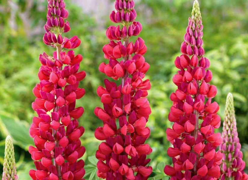 Люпин характеризується суцвіттями до 1,5 м заввишки та великими, щільно розташованими квітами у веселці кольорів. Це морозостійкий багаторічник, який дуже простий у вирощуванні і буде добре використовуватися в будь-якому саду. Висівайте насіння з березня по червень у землю на глибину 3 - 4 см. Їм потрібна водопроникність. грунт, що містить вапно, і сонячне місце. Застосування: багаторічні бордюри, зрізані квіти.