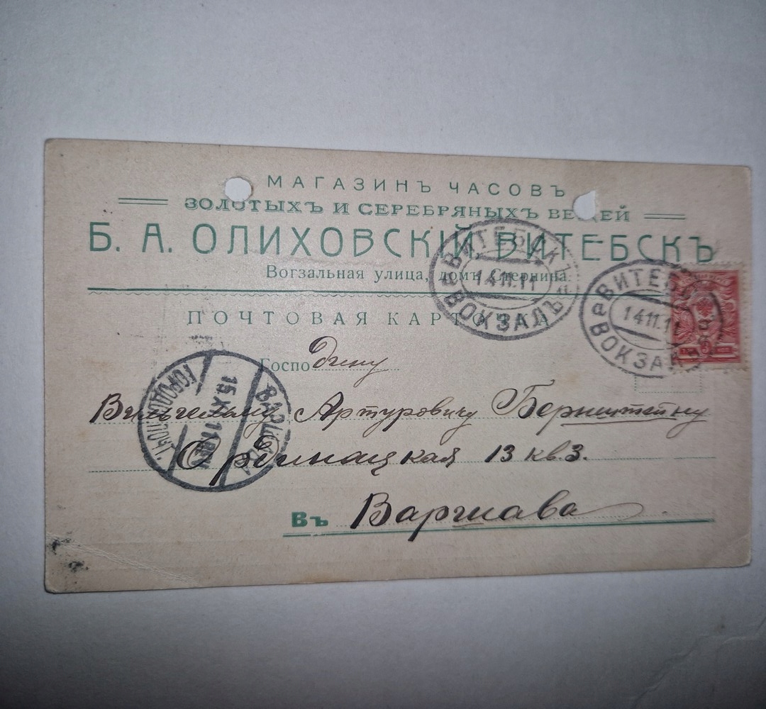 Магазин золотих і срібних годинників Оліховський Вітебськ Варшава 15 листопада 1911р.