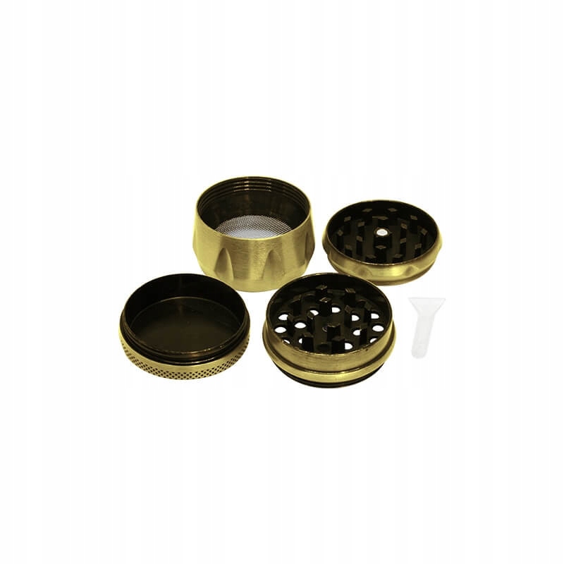 Алюмінієвий подрібнювач, хлопавка, подрібнювач із ситечком для відділення пилку. М'ясорубка з чотирьох частин, що складається з ситечка та лопатки, магнітної застібки, лопатей з отворами та підставки для збору пилку.