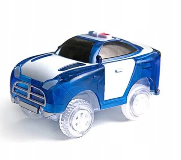 Поліцейська машина білого та темно-синього кольорів має чотири рухомі колеса, завдяки яким вона може пересуватися по рівних поверхнях. Автомобіль оснащений 5 світлодіодами, які не тільки надають йому дивовижний ефект, але й додатково підсвічують напівпрозорі доріжки (з серії Magic Tracks), по яких він їздить!