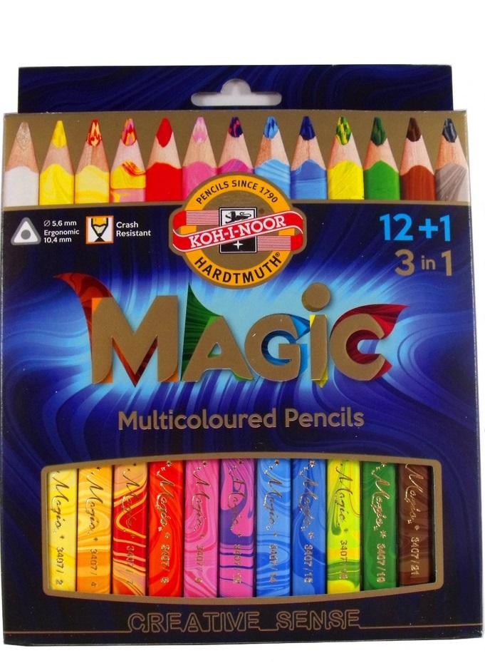Олівці MAGIC TRIO KOH-I-NOOR з яскравою різнокольоровою начинкою. Вони дозволяють створювати вражаючі та унікальні роботи. Використання в олівці трьох відтінків одного кольору надає малюнку тривимірності (ефект 3D). Колір лінії змінюється залежно від повороту, нахилу, напрямку малювання та зносу олівця. Вони мають інтенсивні кольори, а м’яка вставка полегшує малювання. Великий діаметр вставки (5,6 мм) забезпечує стійкість до сильного тиску і зламу, а товста трикутна рамка (10 мм) забезпечує належне ергономічне утримання олівця. Олівці постачаються з блендером - це безбарвний олівець, який використовується для подрібнення, розмивання слідів олівця та змішування кольорів. У набір входить 12 кольорових олівців і блендер.