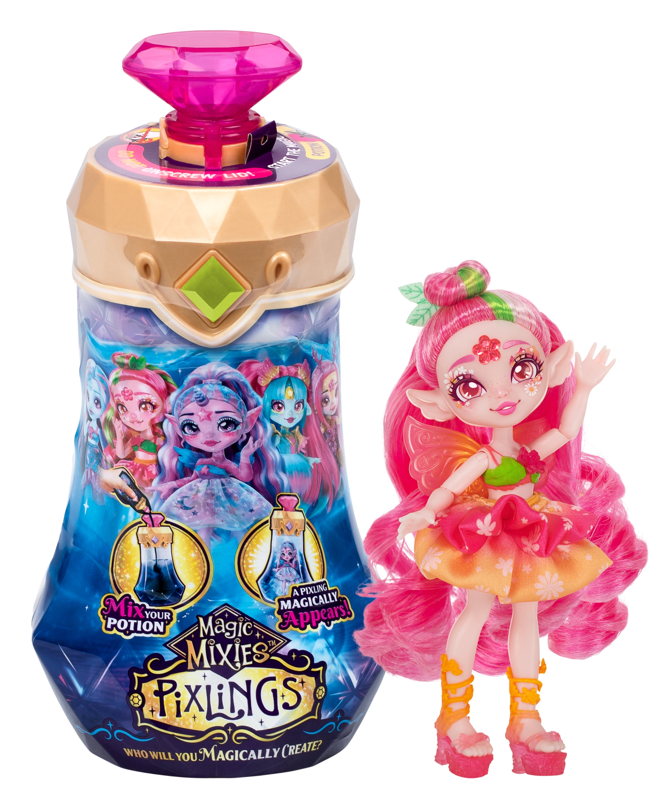 Ваша дитина буде зачарована, коли потрапить у чарівну країну Magic Mixies Pixlings і створить чарівну суміш, яка розкриє чарівну Пікслінг Фей! У країні, де зілля тече з водоспадів і фонтанів, дівчата можуть приготувати власні особливі зілля, щоб чарівним чином розкрити цю прекрасну ляльку Пікслінг. Потім скажіть чарівні слова, поверніться та натисніть Crystal Gem. Фей використовує магію природи, щоб змусити своє серце розквітти від щастя. Її сила зілля — «Радість»! Є 5 різних Пікслінгів, які дівчата можуть чарівним чином створювати та збирати! Кожна лялька заввишки 16,5 см має 7 точок артикуляції, довге розчесане волосся, містичну перлину на чолі, м’який одяг із райдужною обробкою та взуття ручної роботи!
