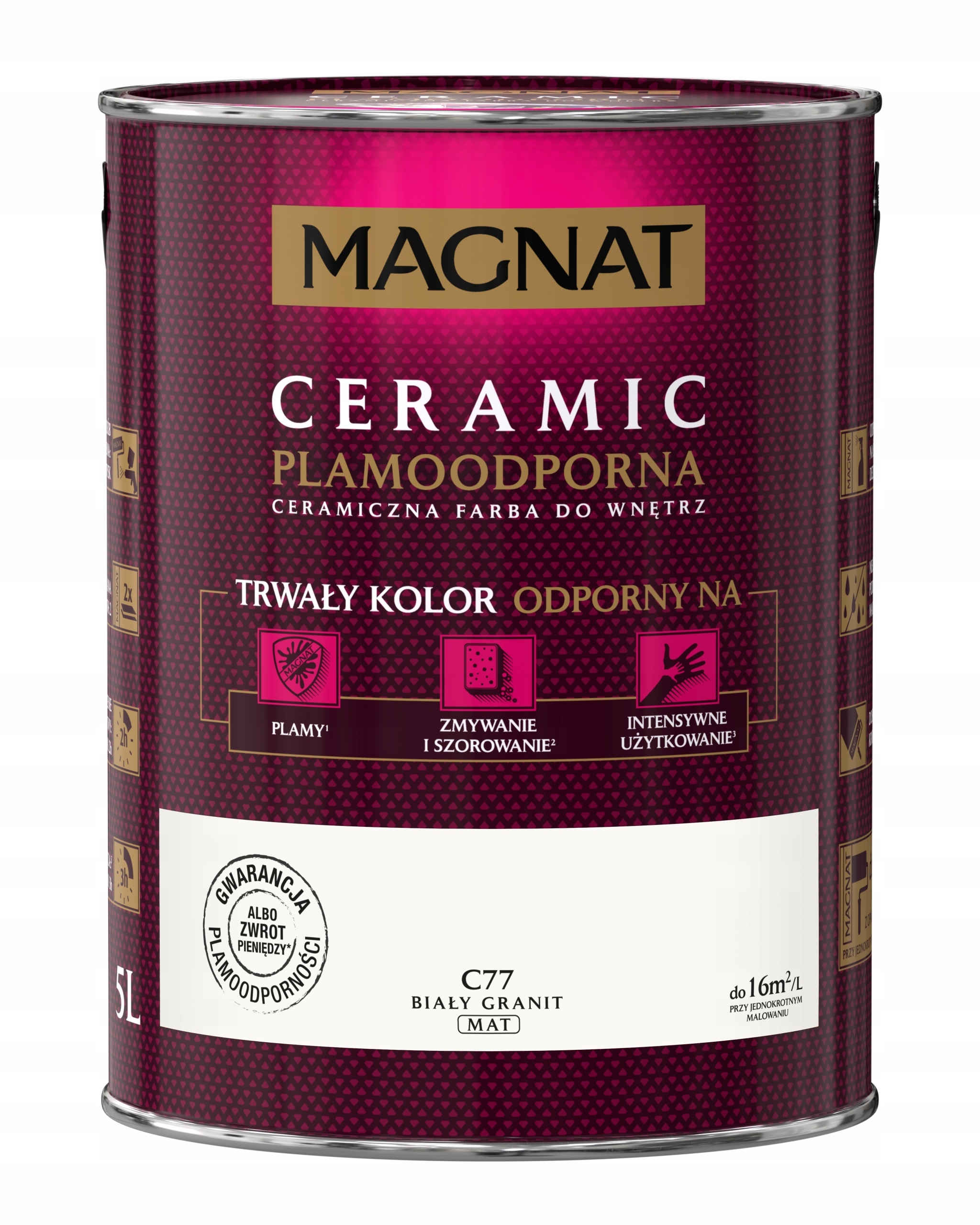Магнатська кераміка - керамічна фарба, стійка до плям, створена на основі найвищої якості смол та пігментів для найвибагливіших одержувачів. Він характеризується вище середньою стійкістю до очищення та повторного миття. Покриття не поглинають важкий бруд і стійкі до дезінфікуючих засобів. Продукт забезпечує відмінне покриття та продуктивність, не плескається під час малювання.