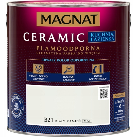 Магнатська керамічна кухня, ванна кімната - це керамічна фарба, яка створює гідрофобні властивості, що особливо рекомендується для декоративної та захисної живопису стін та стелей всередині приміщень, що піддаються періодично зростаючій волозі та конденсації Кухні. Стіни, намальовані з ним, залишаються чистими довгим часом, а їх колір виразний і свіжий.