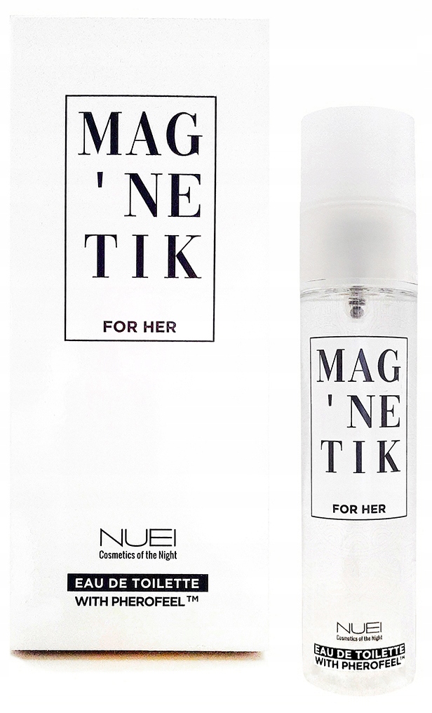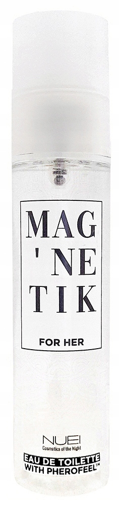 Завдяки концентрації в PHEROFEELTM, MAG'NETIK прагне підкреслити жіночу привабливість і силу на основі активних інгредієнтів, які імітують копуліни ( жіночі феромони, що впливають на вироблення чоловічого тестостерону). MAG'NETIK для неї — єдиний чоловічий одеколон на ринку, який містить PHEROFEELTM для неї, ексклюзивно від NUEI. Дослідження ефективності показало підвищення рівня тестостерону у чоловіків-добровольців порівняно з іншими продуктами плацебо. Його концентрація рослинних інгредієнтів у поєднанні з PHEROFEELTM збільшує тривалість утримання колоній на шкірі. Нанесіть на шкіру два-три спреї. Цей продукт перевірено на безпеку та надіслано до Комісії Європейського Союзу відповідно до вимог Регламенту ЄС № 1223/2009.