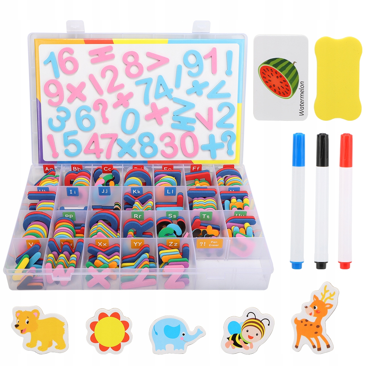 МАГНІТНИЙ НАБІР ABC: цей набір магнітних літер і цифр включає 52 великі літери, 156 малих літер, 20 цифр, 18 математичних символів, 5 магнітів на холодильник на тему мультфільмів, 1 дошку для писання з двома магнітними сторонами, 3 маркери, 1 тканину для дошки EVA, 1 набір (40 шт.) карток з мультфільмами для вивчення англійської мови словниковий запас і 1 міцний ящик для зберігання. З цією розвиваючою іграшкою ваш маленький геній зможе вивчити тисячі слів.