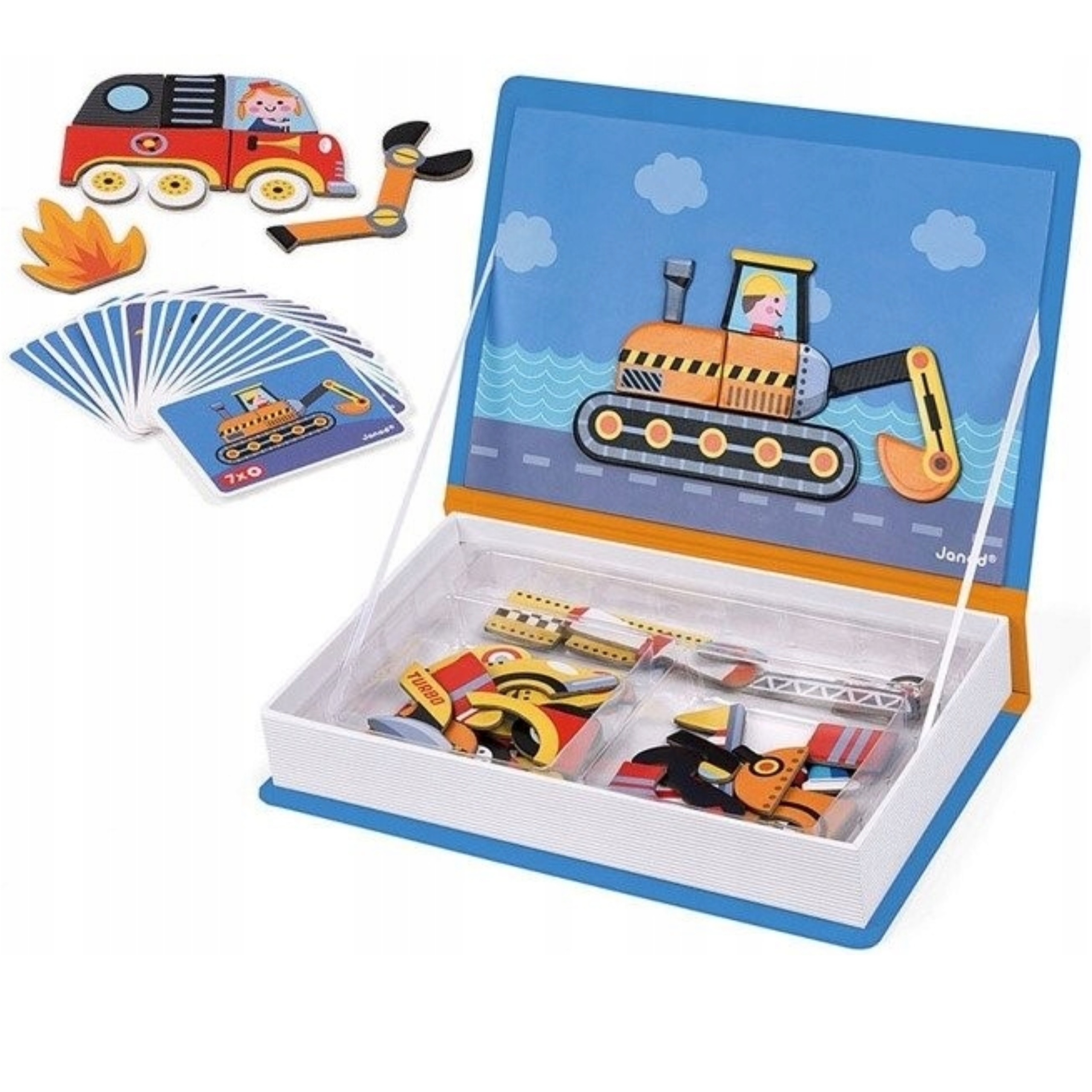 Magnetibook Vehicles містить 50 різнокольорових магнітів з елементами різних видів транспорту, зокрема: екскаватор або пожежну машину та 18 карток із зразковими ілюстраціями транспортних засобів, які можна створити з магнітів.