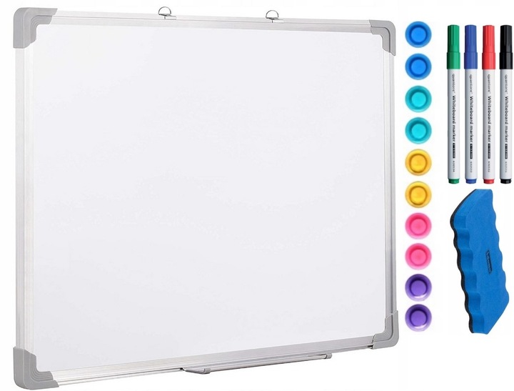 Біла магнітна дошка з двома вішалками, щоб її можна було кріпити на стіні. Дошка має розміри 90х60 см в алюмінієвій рамі і є чудовим рішенням для запису важливої інформації. Дошку також можна використовувати для підвішування карток за допомогою магнітів.
