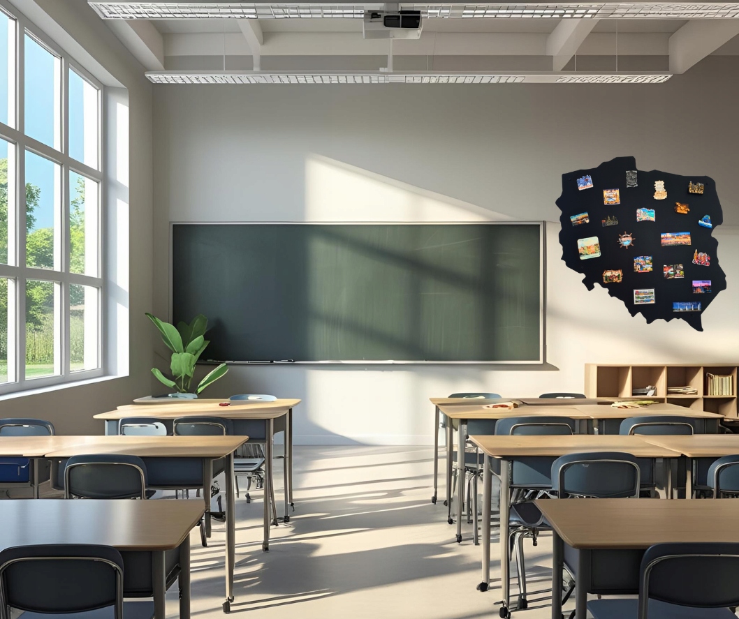 Це ідеальний навчальний інструмент для вивчення географії, історії чи суспільствознавства. На дошці можна представити воєводства, міста, річки чи історичні події. Завдяки можливості прикріплення магнітів чи карток учні можуть брати активну участь у заняттях, що сприяє кращому засвоєнню знань.