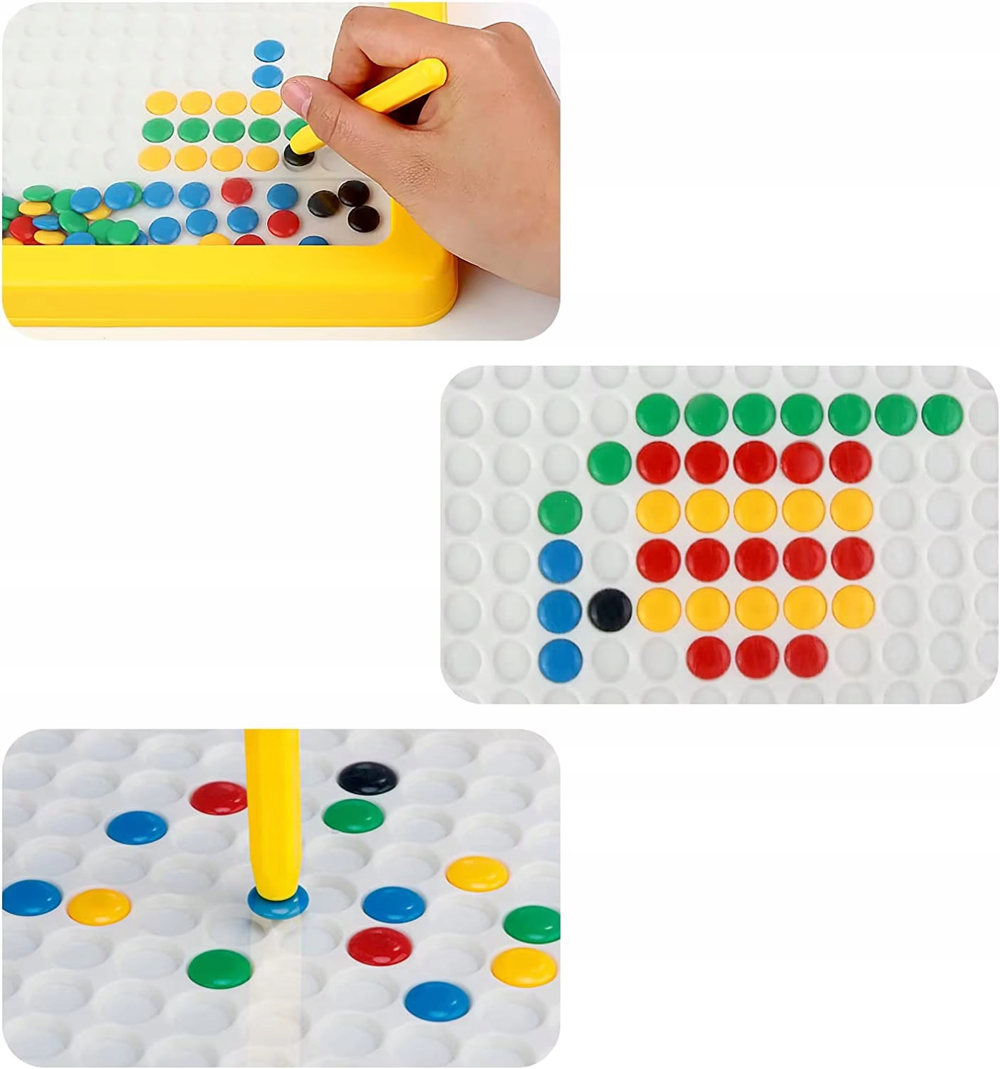 Дитина, що рухається барвистими таблетками на дошку з отворами, створює чудові фотографії, написи або візерунки. 4 із зразками картин. Ви також можете створити власну роботу. Єдине обмеження - це уява та творчість дитини.