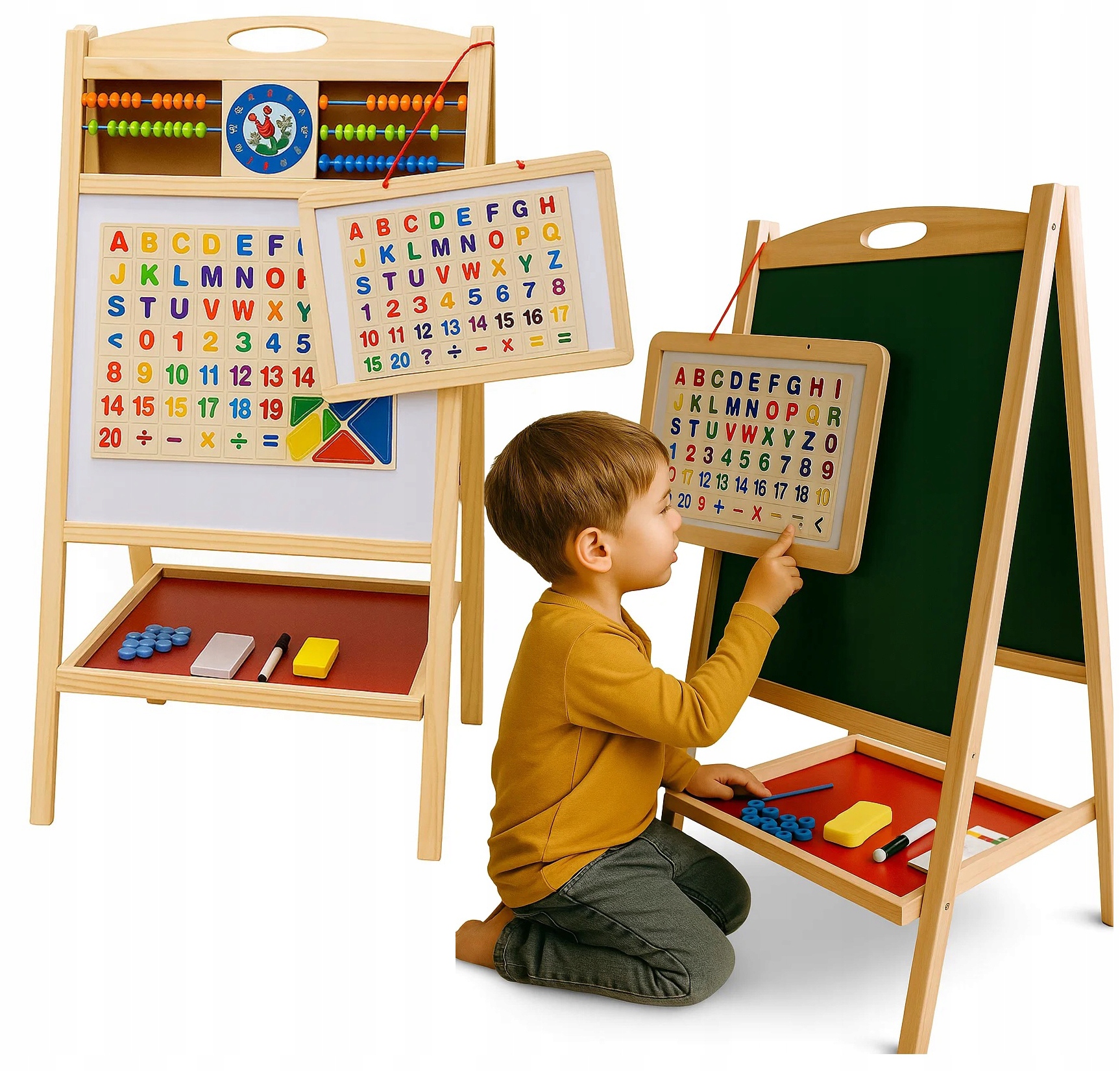 Двостороння навчальна дошка — це ідеальне поєднання крейдової дошки та магнітної дошки для сухого стирання, збагаченої абаком, додатковою двосторонньою підвісною дошкою та практичною полицею для аксесуарів.