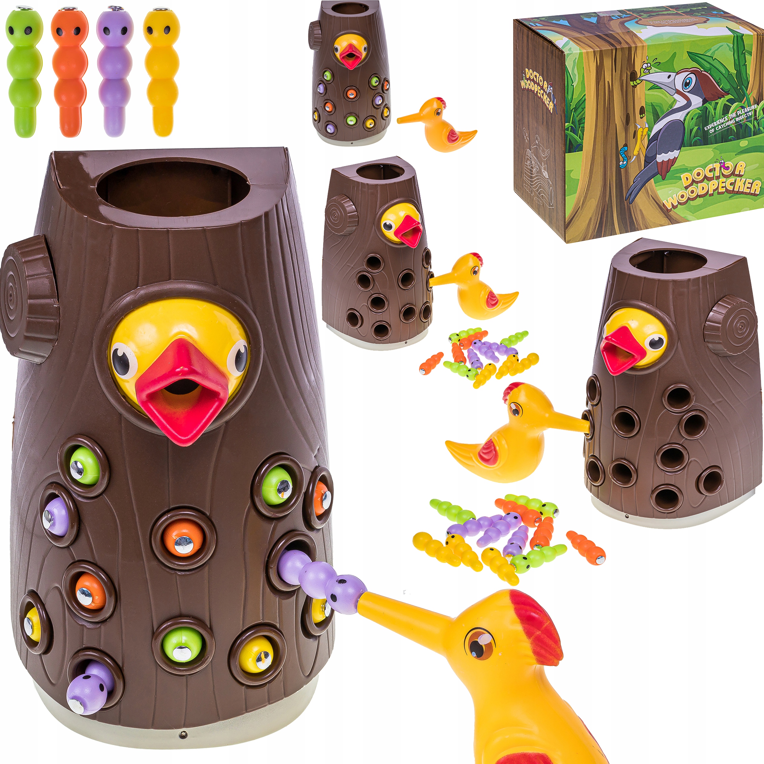 Аркадна гра «Дятел і черв’яки» — інноваційна та весела пропозиція для дітей. Ця магнітна гра складається з двох елементів: дерев'яного дятла і маленьких різнокольорових жучків. Завдання дитини - нагодувати голодне пташеня хробаками та врятувати дерево від шкідників.