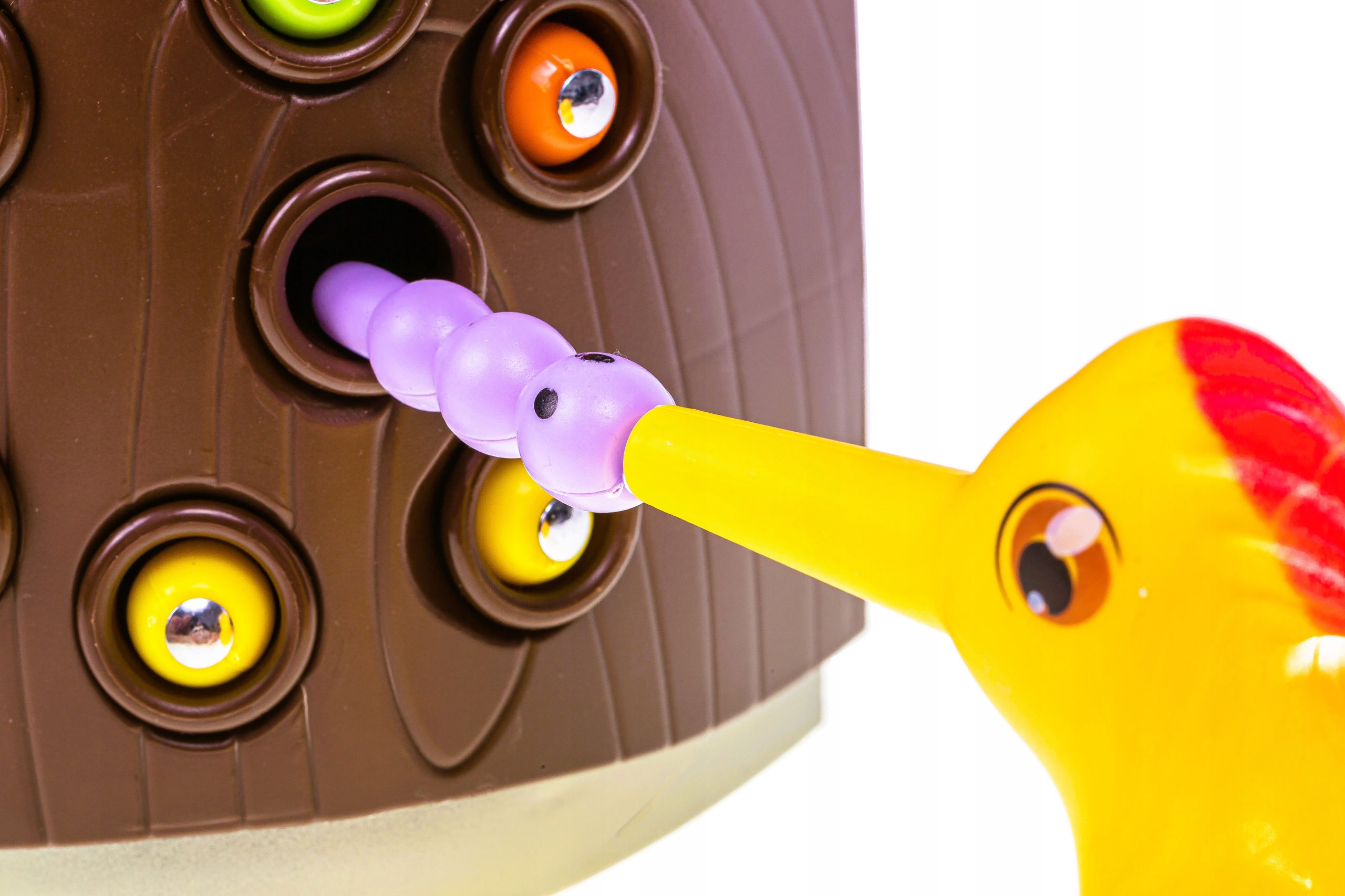 Завдання дитини - зіграти роль пташки-матусі та витягнути за допомогою пташки черв'ячків із колоди та точно помістити їх у дзьобик голодного курчати . Завдяки магнітним елементам у гру можна грати будь-де - батарейки не потрібні! Під час гри можна вводити елементи розповідей про природу, розпізнавання кольорів та рахунок.