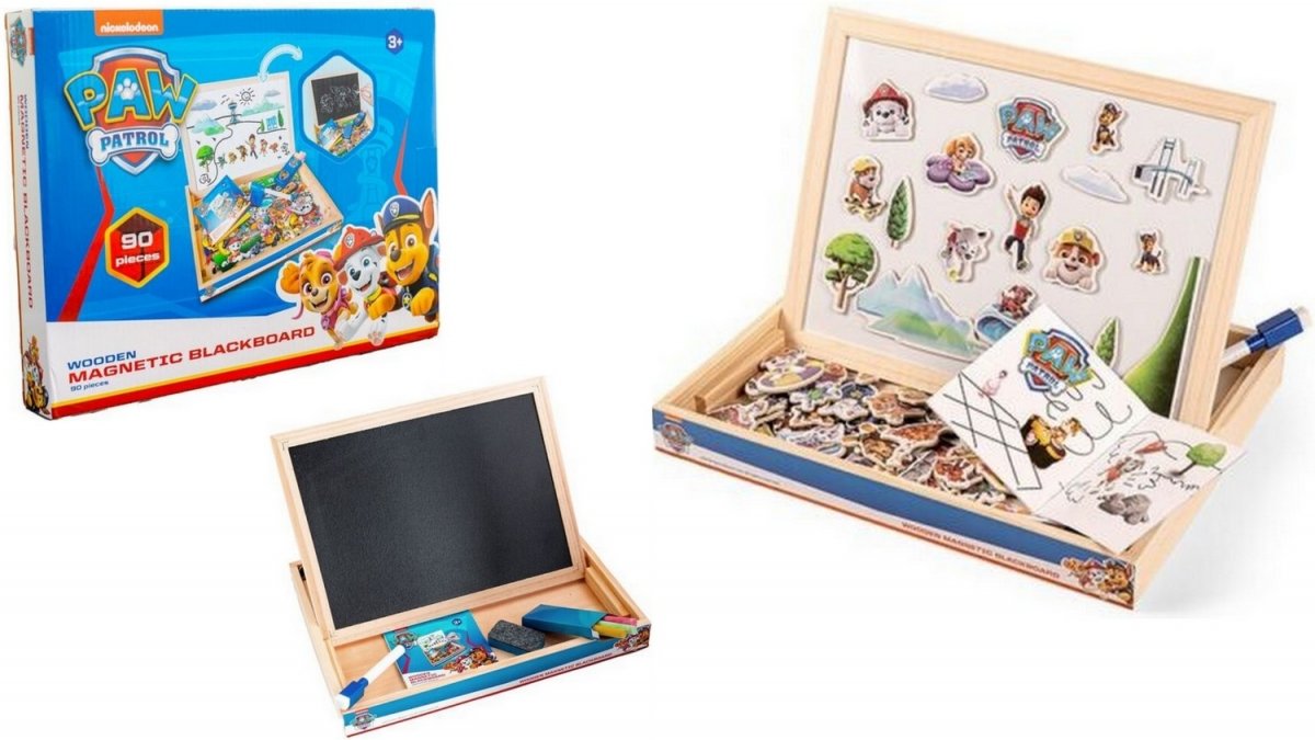 Дитина може писати на ній. білу дошку маркером для сухого стирання та прикріпіть різнокольорові магнітиз мотивами Paw Patrol, створюючи різноманітні малюнки. Діти можуть малювати крейдою на чорній стороні.