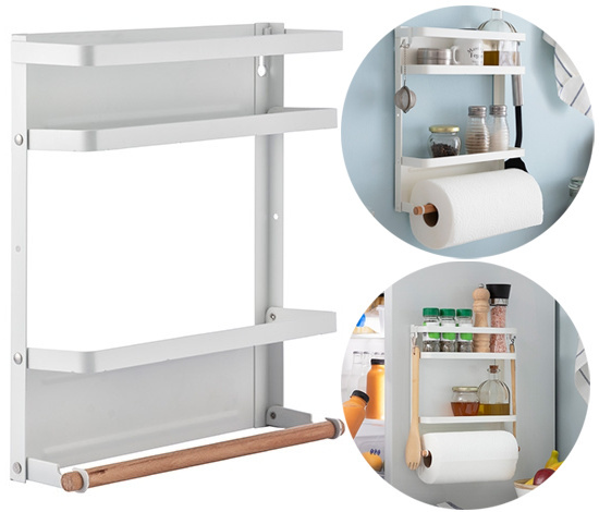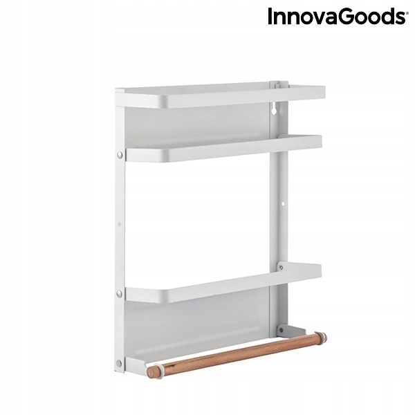 Надзвичайно універсальна, міцно виготовлена магнітна полиця-органайзер, чудово використовує простір, оскільки дозволяє зберігати всі види предметів, таких як банки, банки, рулони паперу, тканини , рушники, посуд, посуд, миючі засоби тощо на кухні, у ванній кімнаті тощо. Органайзер складається з двох легко складаних полиць, оснащених планкою, яка захищає речі, що зберігаються; два рухомих гачки і дерев'яний брусок для валиків, полотна тощо