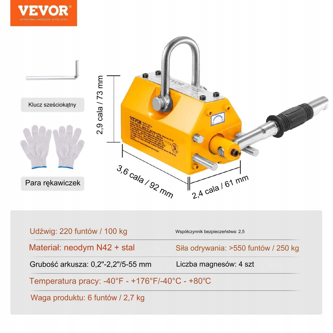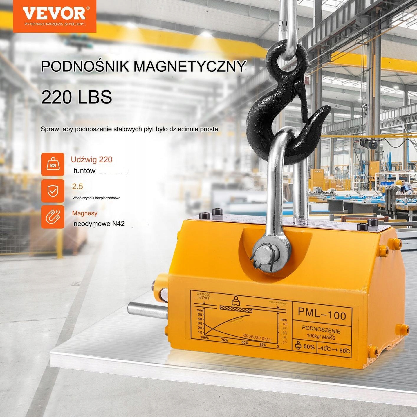 Магнітний підйом з постійною міцністю дозволяє підняти навантаження до 100 кг. Використовує N42 неодимові магніти, що дозволяє ефективно піднімати сталеві матеріали без необхідності електроенергії.