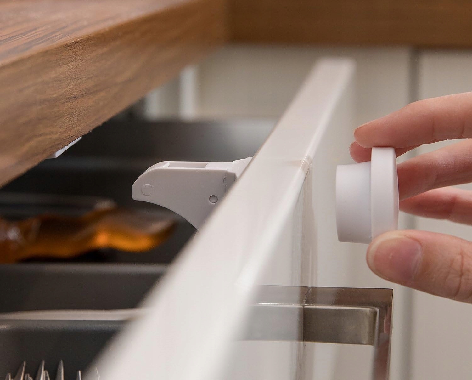 Замки монтуються всередині шаф, завдяки чому повністю приховані від очей. За допомогою магнітного ключа ви легко відімкнете меблі, не демонтуючи замок. Це ідеальне рішення для батьків, які піклуються про безпеку та естетику інтер'єру.