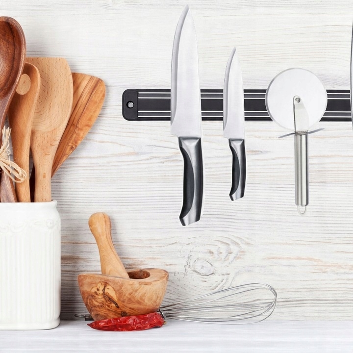 Магнітна стрічка є ідеальним рішенням для зберігання ножів, кухонного начиння та інструментів в естетичний та функціональний спосіб. Завдяки магнітній поверхні ви легко та зручно розміщуєте предмети на смузі, що дозволяє підтримувати порядок.