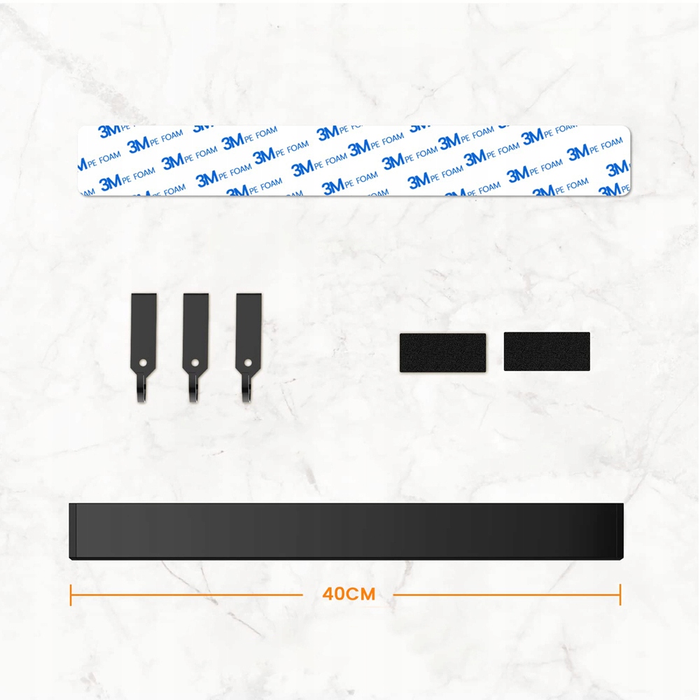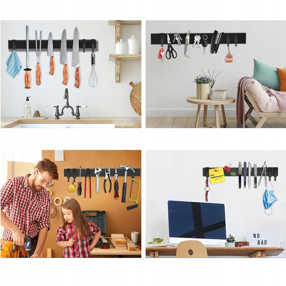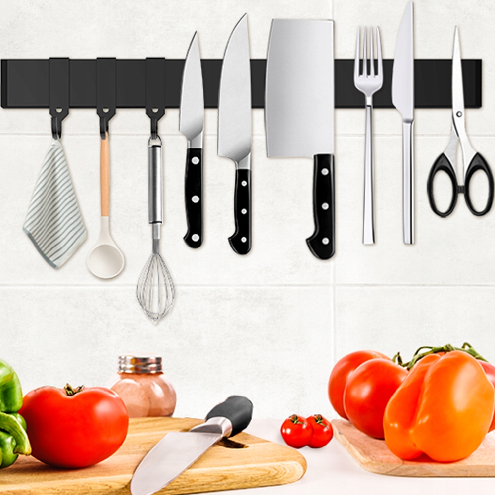 Довжина 40 см забезпечує достатньо місця для зберігання інструментів, а три знімні гачки забезпечують додаткову універсальність, ідеально підходить для підвішування невеликих предметів, таких як кухонні гаджети, ключі чи рукавички.