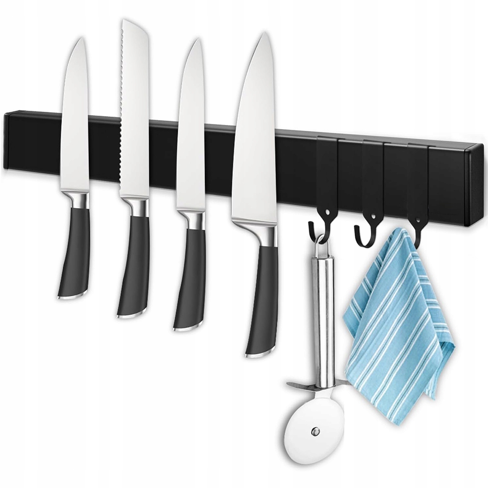 МАГНІТНА ВІШАЛКА 40 СМ З НЕРЖАВІЮЧОЇ СТАЛІ З 3 ЗНІМНИМИ ГАЧКАМИ ДЛЯ НОЖІВ