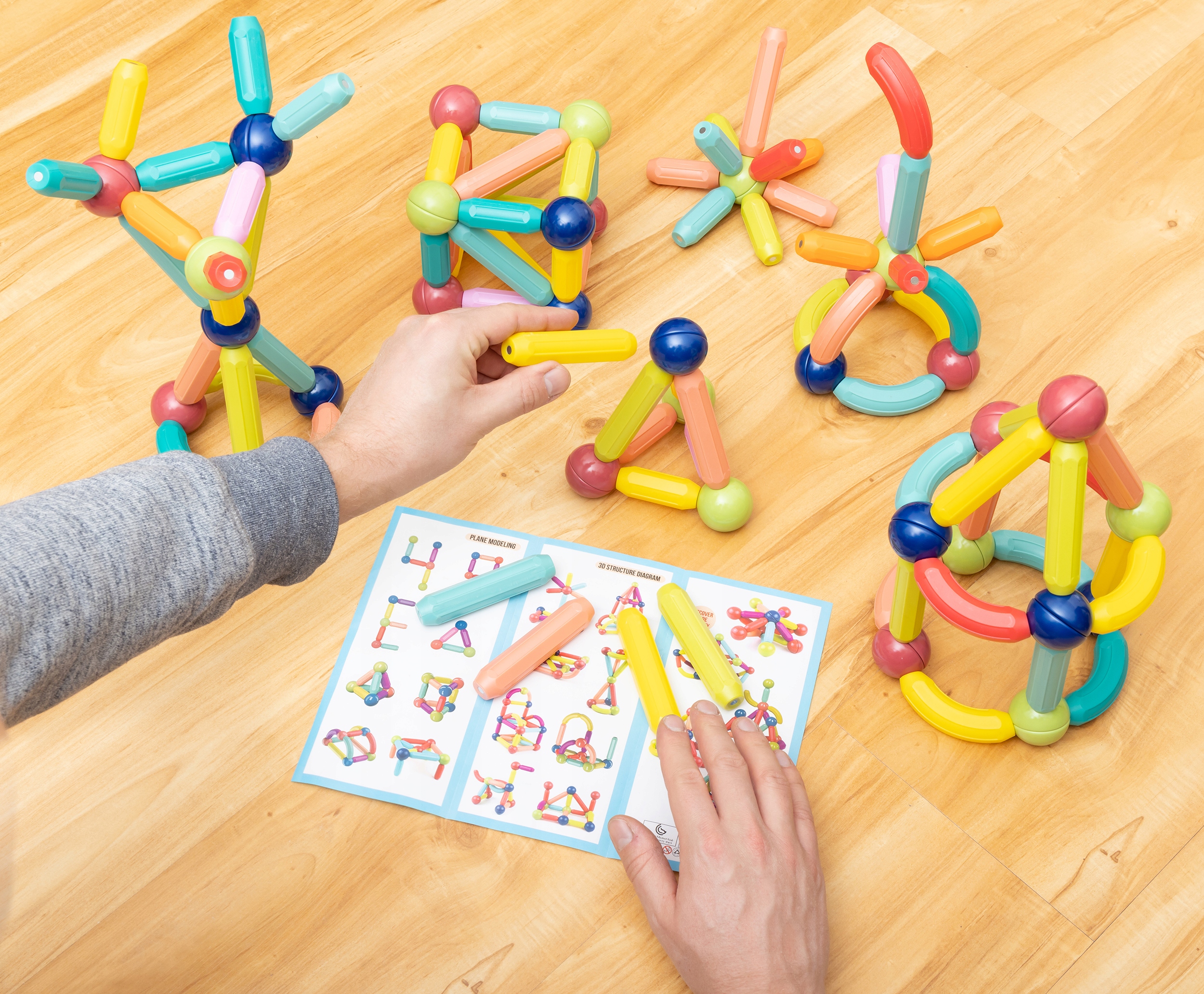 Блоки з’єднуються один з одним простим способом, уможливлюючи будь-яку будівлю. Магнітні з'єднання гарантують точне з'єднання та створення стійких структур.