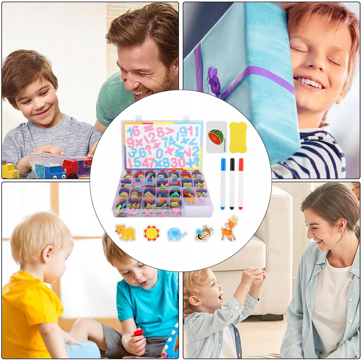 УНІВЕРСАЛЬНЕ ЗАСТОСУВАННЯ: магніти, що входять до комплекту, можна прикріпити до холодильника або будь-якої іншої магнітної поверхні. Завдяки цим простим, веселим і творчим заняттям діти можуть навчитися писати на магнітній дошці, складати речення та виконувати математичні дії.