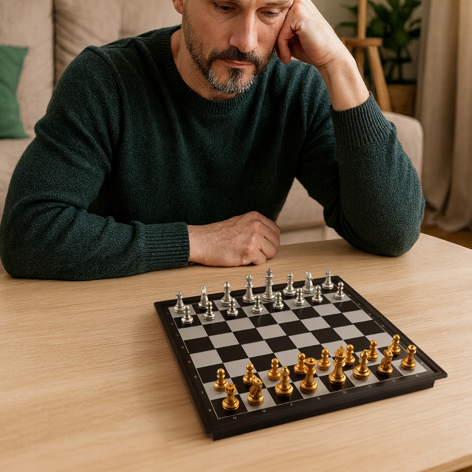 Компактний магнітний шаховий набір - ідеальна пропозиція для любителів королівської гри, які хочуть завжди мати свою дошку під рукою. Магнітні фігурки в елегантних кольорах золота та срібла надійно тримають дошку, тому грати можна навіть під час подорожі - у потязі, машині чи на природі.