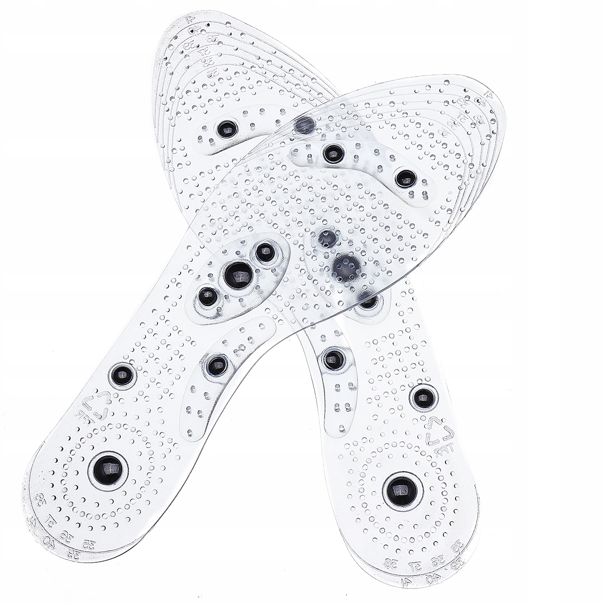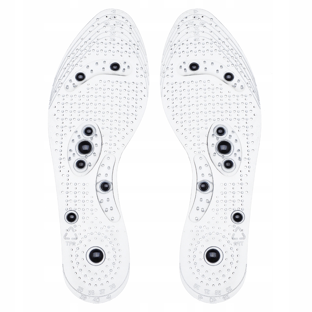 Вставки магнітних взуття забезпечують масаж усієї поверхні стопи . Вони працюють на основі акупресури. Магнітні хвилі досягають усіх точок ніг, що приносить полегшення всім недугам тіла. У нозі є 7000 нервових закінчень, їх масаж призводить до того, що все тіло підсилюється на кожному кроці. Масаж акупресура зміцнить ваше тіло і пом'якшить втому. Щодня носіння устілки запобіжить набряку та втому ніг. Вставки можна носити цілий день у будь -який час, особливо вони хороші під час занять спортом, на роботі чи зусиллях. Покладіть ногу на магнітну вставку, щоб вони не виступали з будь -якої сторони поза вставкою. Виріжте непотрібні частини вставок ножицями, якщо вони занадто великі . Вставте магнітну вставку в взуття і перевірте його правильне розташування всередині. Вставка не може згинати або боляче.