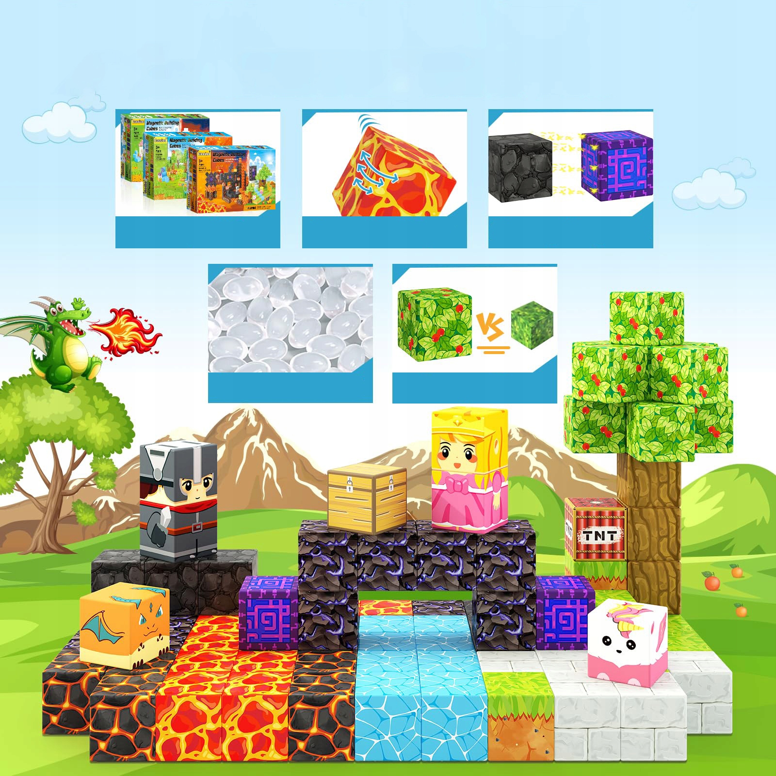 【Захоплююча пригода з порталом】 Встановити захоплюючі поїздки з нашими 79-елементними магнітними блоками та випробувати захоплюючу пригоду з порталом! Відкрийте для себе два різних світи: жвавий ліс з вишневими квітами та луками з одного боку та пейзаж річок лави, вулканічного попелу та драконів з іншого. Діти можуть побудувати свої пригоди - від обхідних земель, наповнених лавою, до відкриття зачарованих лісів з хоробрими лицарями та елегантними принцесами. Будьте готові до незабутньої подорожі!