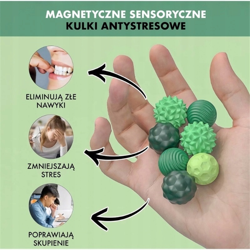 Кожна з чотирьох кульок має різну текстуру та структуру, що забезпечує різноманітність тактильних відчуттів. Завдяки вбудованим магнітам їх можна вільно комбінувати, що створює додатковий релаксуючий ефект. Маніпуляція кульками допомагає зменшити нервове напруження, покращує кровообіг і підтримує уважність. Це чудовий спосіб розслабитися після довгого робочого дня або як засіб антистресової терапії.