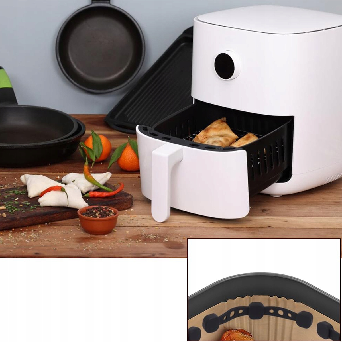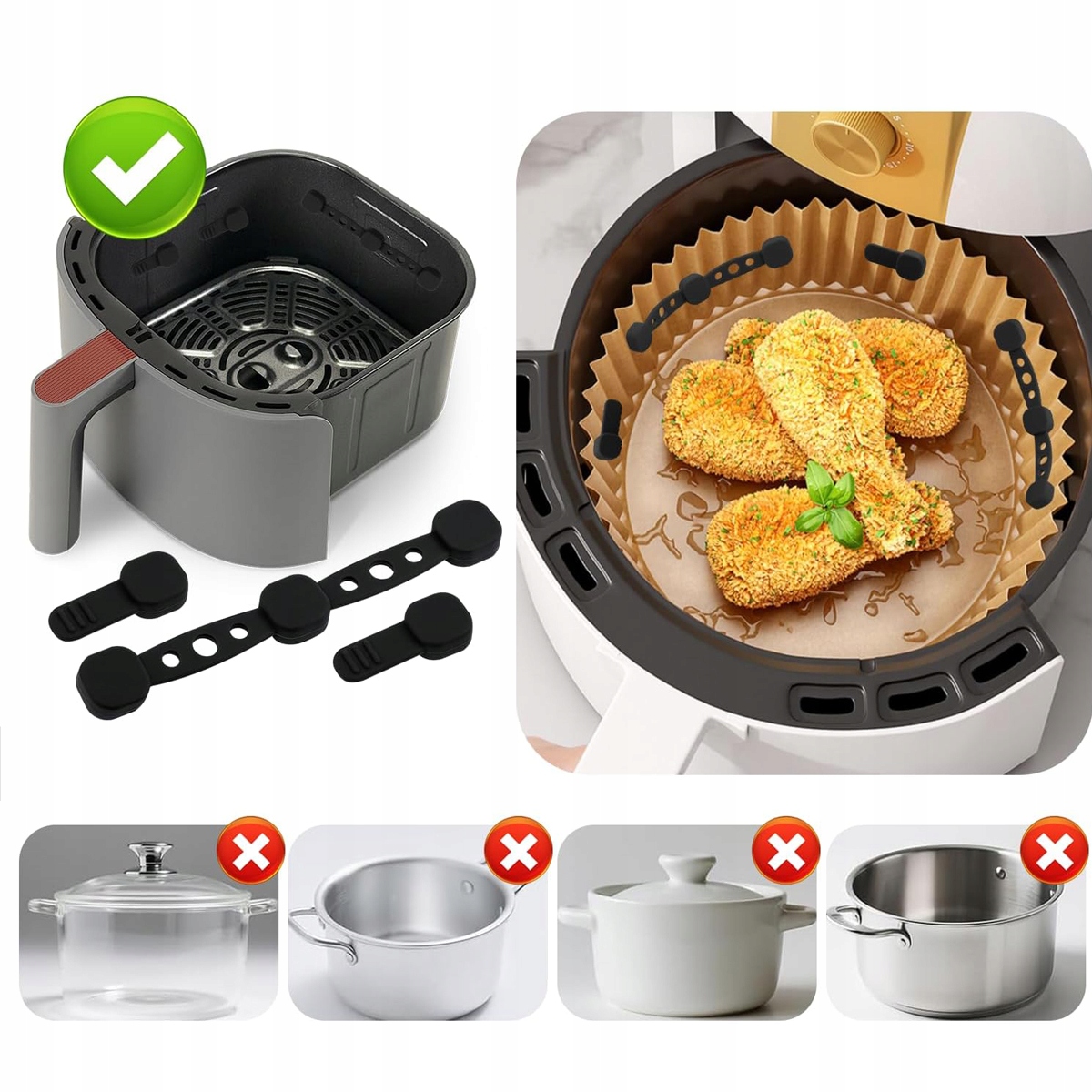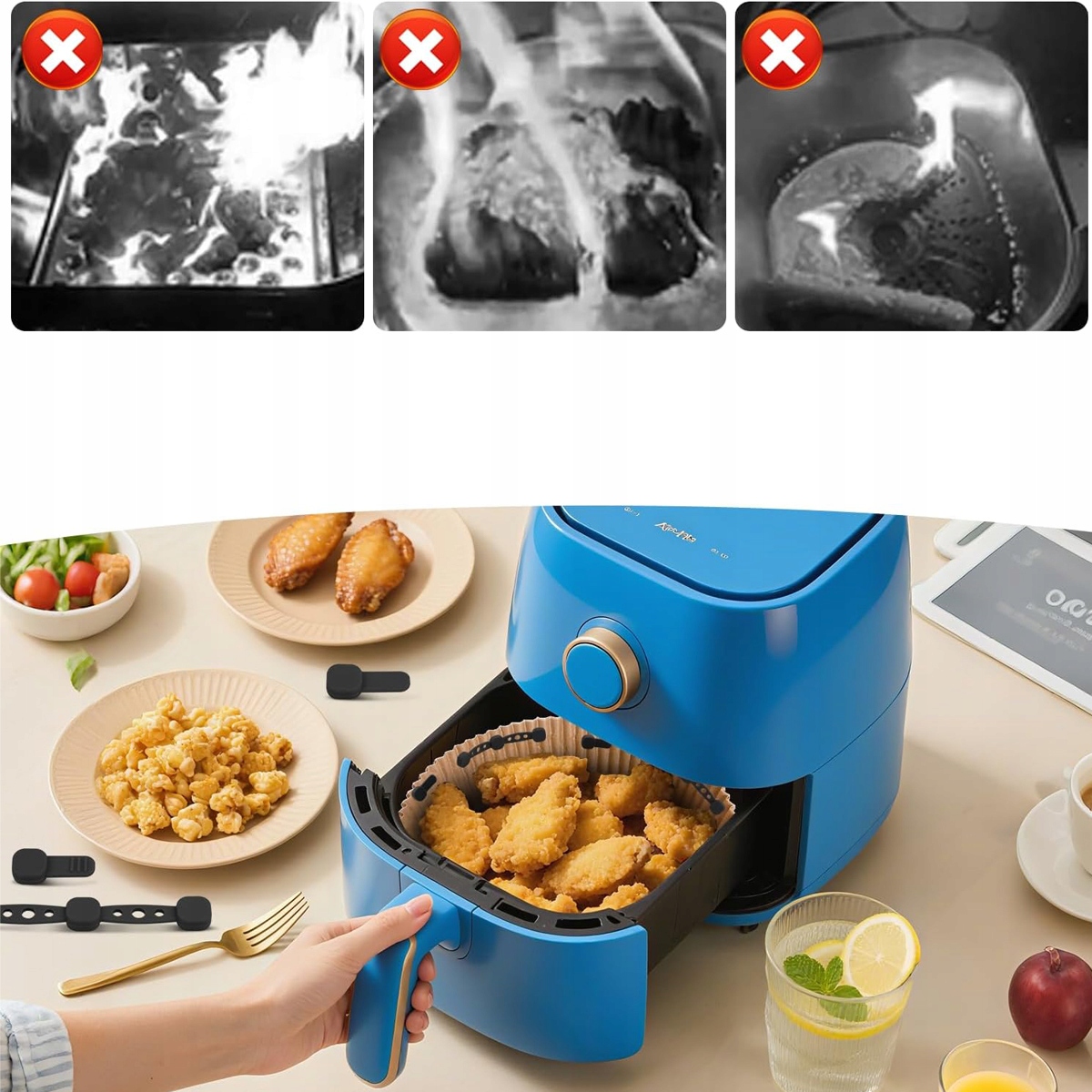 Магнітне силіконове закриття фритюрниці розроблено спеціально для захисту пергаментного паперу всередині пристрою. Це ефективно запобігає прилипанню одноразової паперової фольги до їжі або її контакту з нагрівальним елементом і підгорянню. Така конструкція забезпечує безпечніше приготування їжі та запобігає непотрібній небезпеці пожежі.