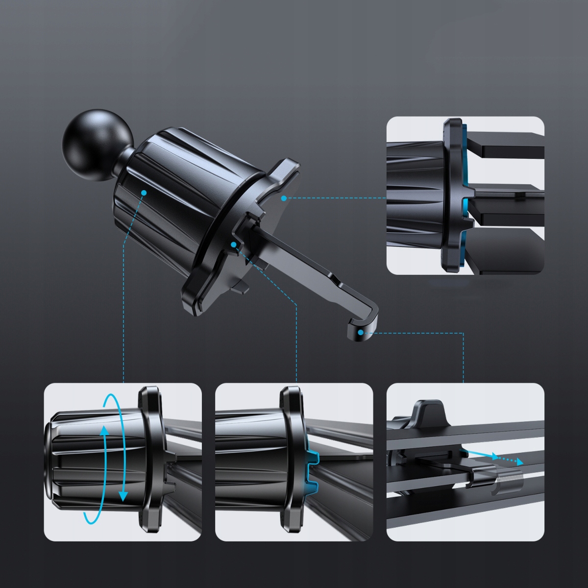Завдяки своїй конструкції тримач можна встановити у вентиляційний отвір без жодних додаткових гвинтів чи стрічок!