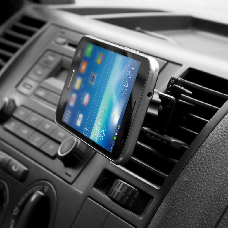 Універсальний тримач для мобільного телефону, встановлений на вентиляційній решітці, — пропозиція для водіїв, які не хочуть обмежувати видимість на лобовому склі.