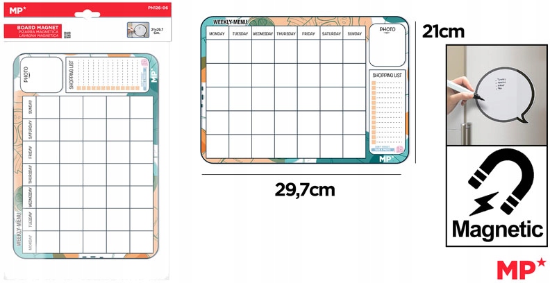 Магнітний планер для холодильника (можна мити), покритий ламінатом, який захищає роздруківку від пошкоджень. Водночас це дозволяє писати сухостираними чи крейдовими фломастерами та без проблем стирати написи.