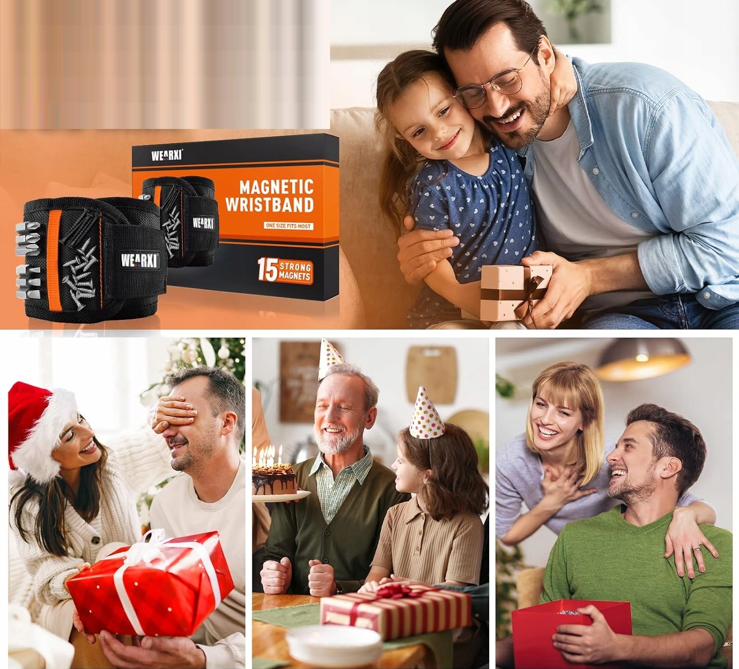 - �Подарунки до Дня батька: вбудовані 15 надсильних магнітів, більше, ніж будь-який інший продукт на ринку, для зберігання невеликих інструментів. Ідеально підходить для надійного кріплення таких предметів, як шурупи, цвяхи, свердла, гайки, шайби, насадки та дюбелі на вашому зап’ясті! Легкі та зручні, вони допоможуть вам у роботі. Підсумовуючи, це подарунок для чоловіків, які хочуть виконувати свою роботу простіше, швидше та зручніше.