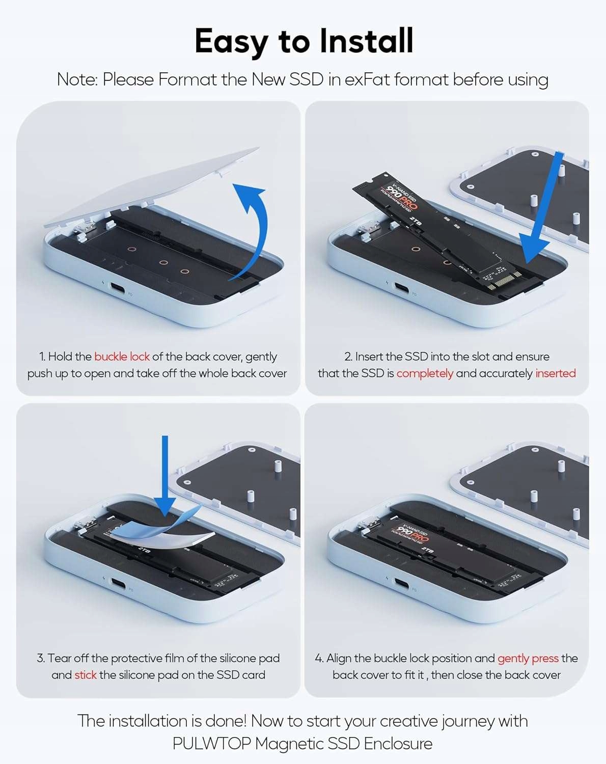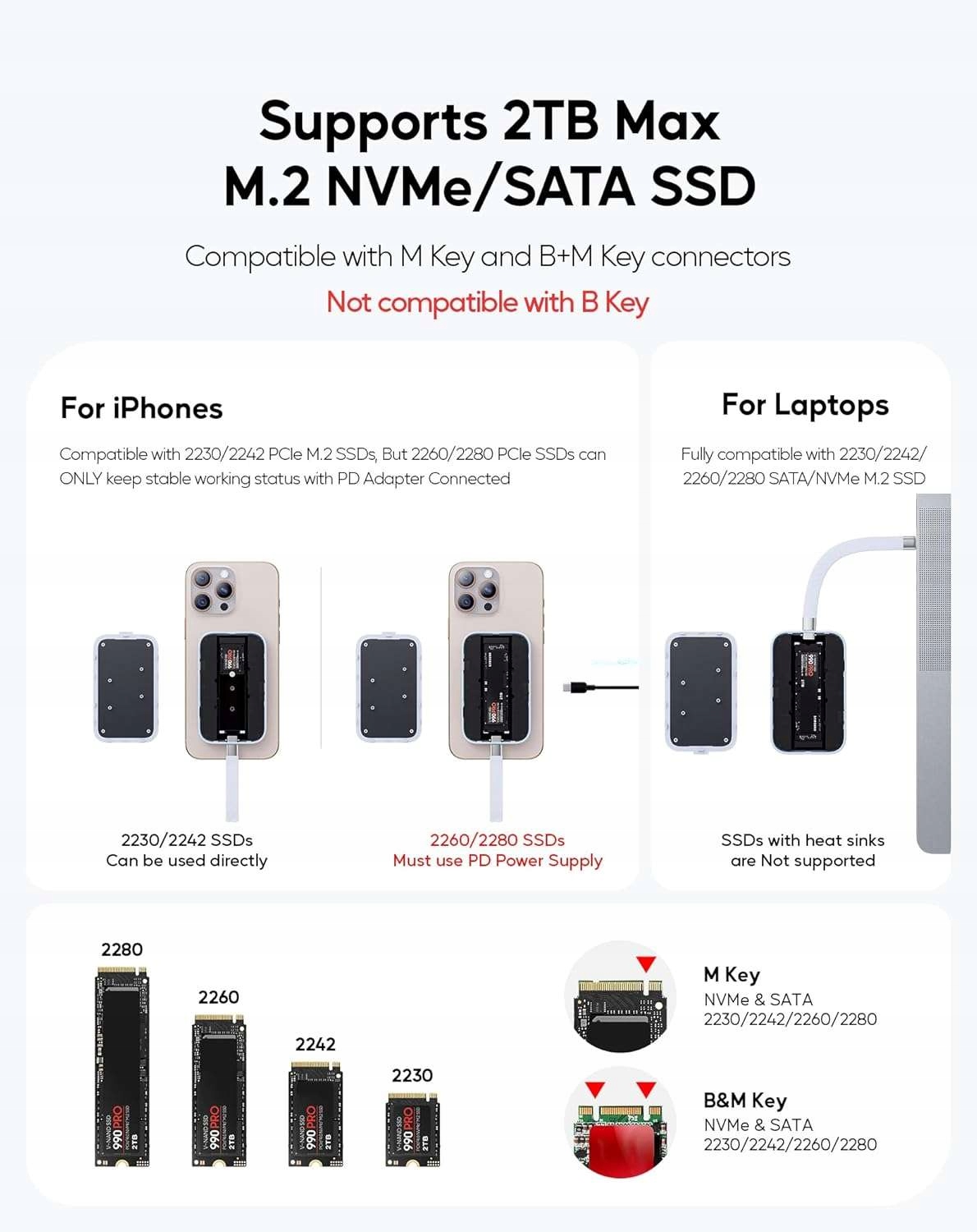 - 2 В 1 МАГНІТНИЙ чохол для твердотільного накопичувача — сумісний із більшістю твердотільних накопичувачів PCIe з протоколом NVMe (клавіша B+M/клавіша M), магнітний чохол для твердотільного накопичувача PULWTOP для iPhone підтримує розширення ємності до 4 ТБ. 1) Для iPhone: сумісні з SSD-накопичувачами PCIE M.2 2230 і 2242, SSD-накопичувачі PCIe 2260/2280 зберігають стабільну роботу ТІЛЬКИ за підключеного адаптера PD; 2) Для ноутбуків: працює з більшістю твердотільних накопичувачів PCIe3.0 NVMe M.2 розміром 2230/2242/2260/2280; 3) НЕ підтримує SSD-накопичувачі SATA та SSD-накопичувачі з радіаторами.