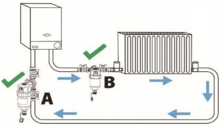 ➡ Фільтр повинен бути встановлений під котлом при поверненні води. Правильне налаштування фільтра (рекомендоване кріпильне положення A і B)