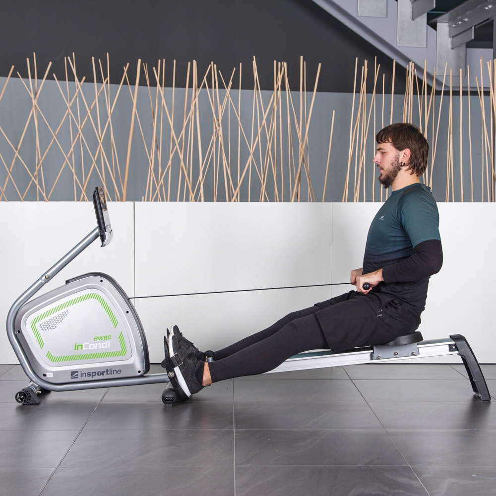 Гребний тренажер inSPORTline RW60 оснащений 8-кілограмовою системою маховика, 16 рівнями навантаження та магнітною гальмівною системою.
