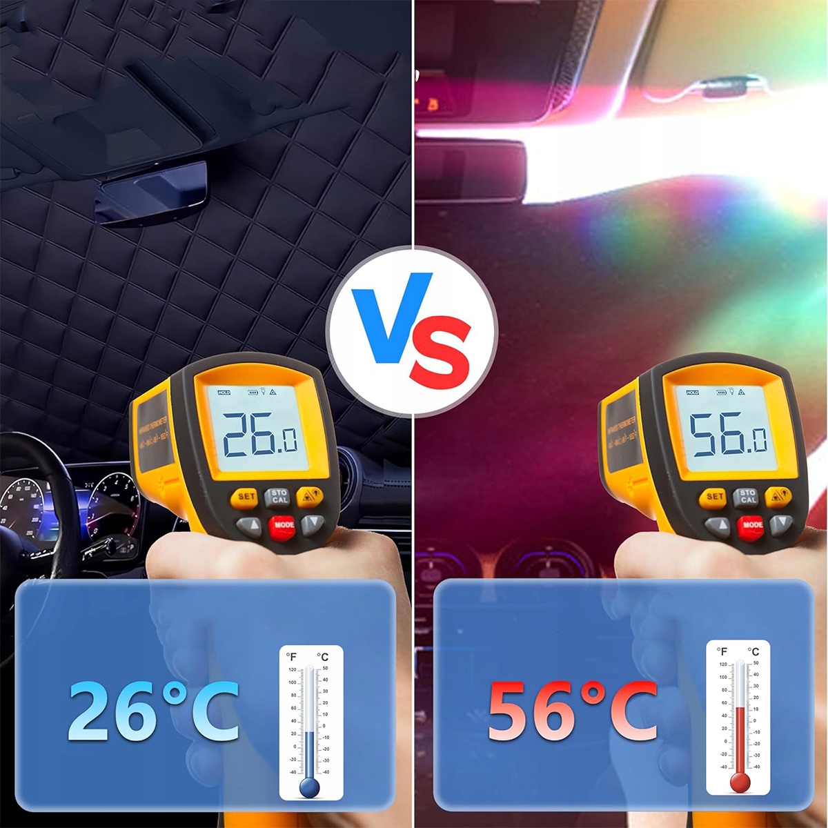 🔥МІЦНИЙ: козирок лобового скла автомобіля виготовлено з чудової сріблястої алюмінієвої фольги PEVA, бавовни спанлейс, щільної композитної бавовни та м’якого чорного нетканого матеріалу. Він стійкий до розривів, більш міцний і зменшує теплопровідність. На відміну від інших продуктів, наша сонцезахисна шторка на лобове скло важить 370 г.