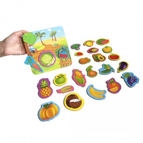 Дошка має розмір 16x15 см, а елементи пропорційні за розміром, що допомагає дітям навчитися розрізняти різні фрукти та овочі.