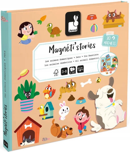 Магнітний пазл Pets Magneti'stories від французького бренду Janod дозволяє дітям створювати теплі, смішні та креативні сценки з життя улюблених домашніх тварин. Завдяки різнокольоровим магнітам ваш малюк може будувати власні історії - від годування собак і котів до спільної гри та відпочинку 🌟🐾