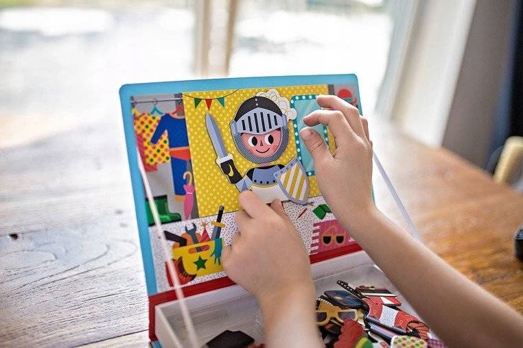 Magnetibook Disguises Boys містить 36 різнокольорових магнітів з елементами костюмів хлопчиків, завдяки яким ви можете стати, наприклад, піратом, космонавтом або лицарем і 8 карток із зразками ідей маскування, які можна створити з магнітів. Це чудова розвага для маленьких костюмерів, а також для всіх творчих дітей.