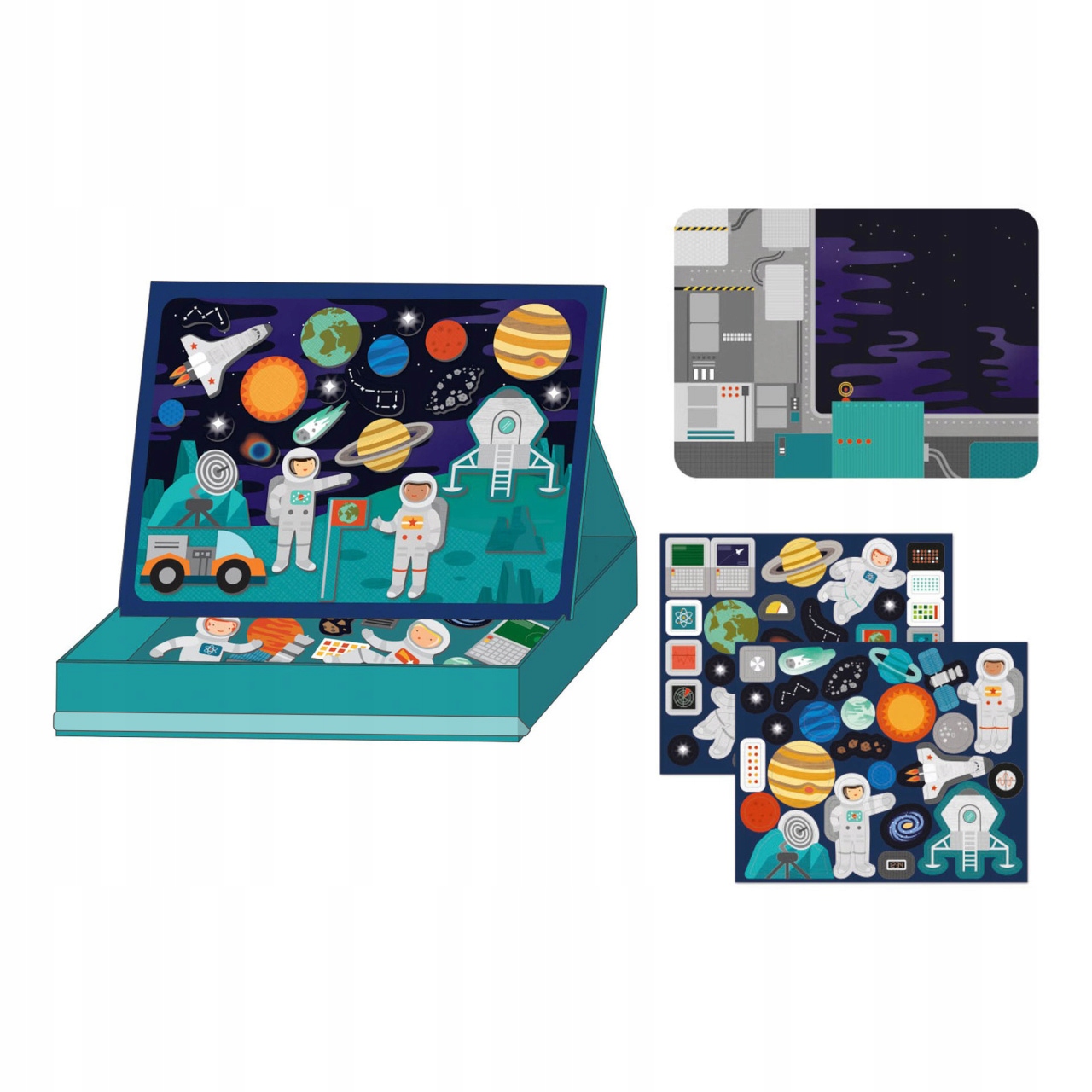 Прикрасьте сцену в космосі або на космічній станції. Цей портативний ігровий набір має два фони на вибір, а також понад 54 магнітні елементи. Магнітна сцена може бути побудована завдяки секундором у коробці. Творча іграшка з нескінченними комбінаціями та сценами. Підставка в стилі стенду містить гнучку еластичну смугу, яку можна використовувати для швидкого очищення. Для дітей віком від 3 років. Основні особливості: 50 магнітних елементів 2 магнітні дошки з фіксованою структурою, виготовленими з перероблених матеріалів, надрукованих з овочевою чорнилом, - це стандарти безпеки