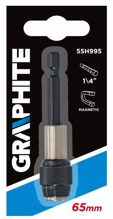 Магнітний тримач GRAPHITE (поз. 55H995) для 1/4" викруток. Довжина 65 мм і потужний магніт забезпечують сумісність з всі типи насадок для викруток. Додаткова функція рукоятки - шарнір, який дозволяє працювати з нахилом до 15° - полегшує роботу. у важкодоступних місцях конструкція дозволяє швидко замінити наконечник без необхідності послаблювати ручку викрутки