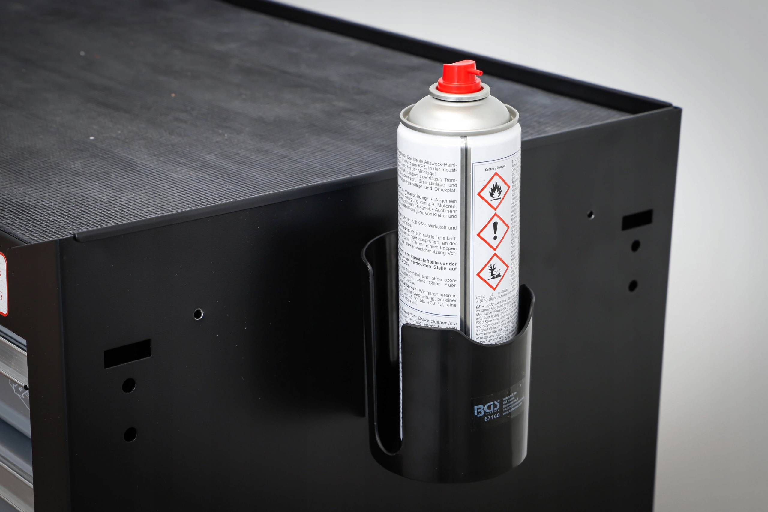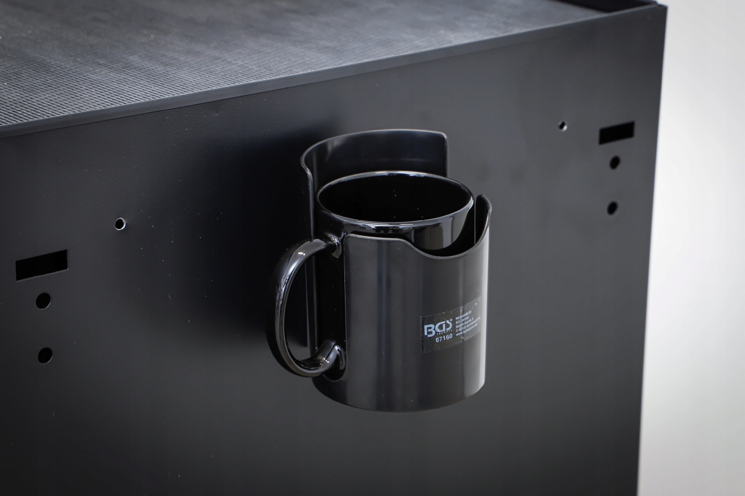 Магнітний тримач BGS67160 дозволяє надійно прикріплювати чашки, банки, пляшки та аерозолі до металевих поверхонь завдяки дуже сильному магніту на тильній стороні. Рукоятка має діаметр 88 мм і висоту 188 мм, що забезпечує універсальне використання в майстернях і службових автомобілях.
